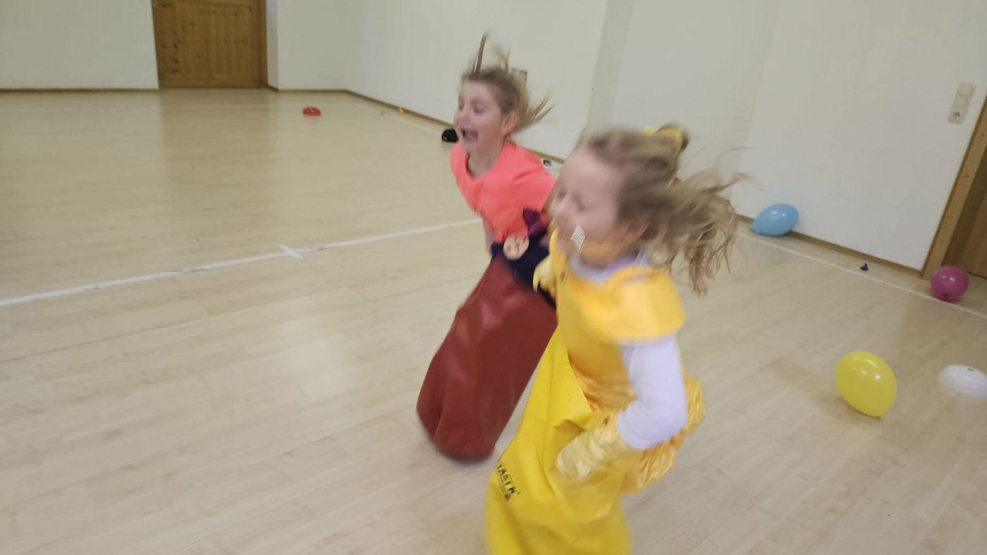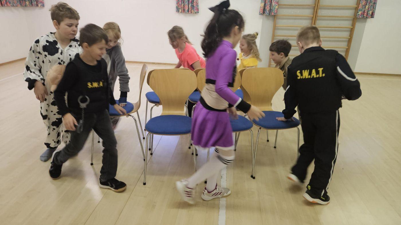 Endlich nach der Faschingsjause ging es mit einer Polonaise, durch das ganze Schulhaus, los. Im Turnsaal gab es dann viele lustige Stationen und Spiele.