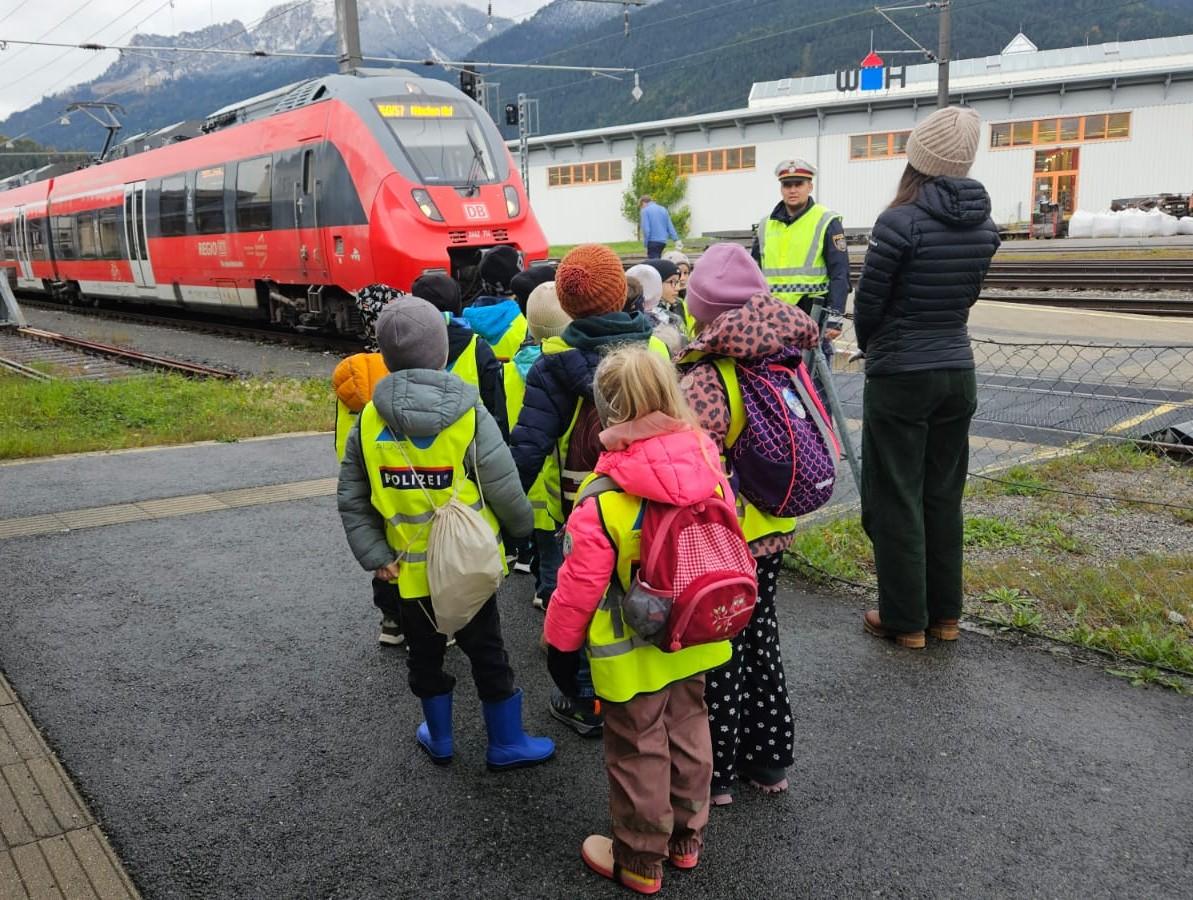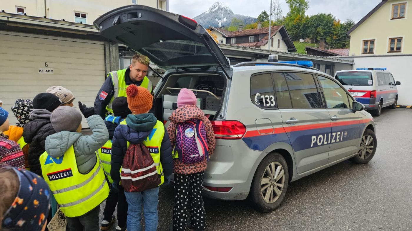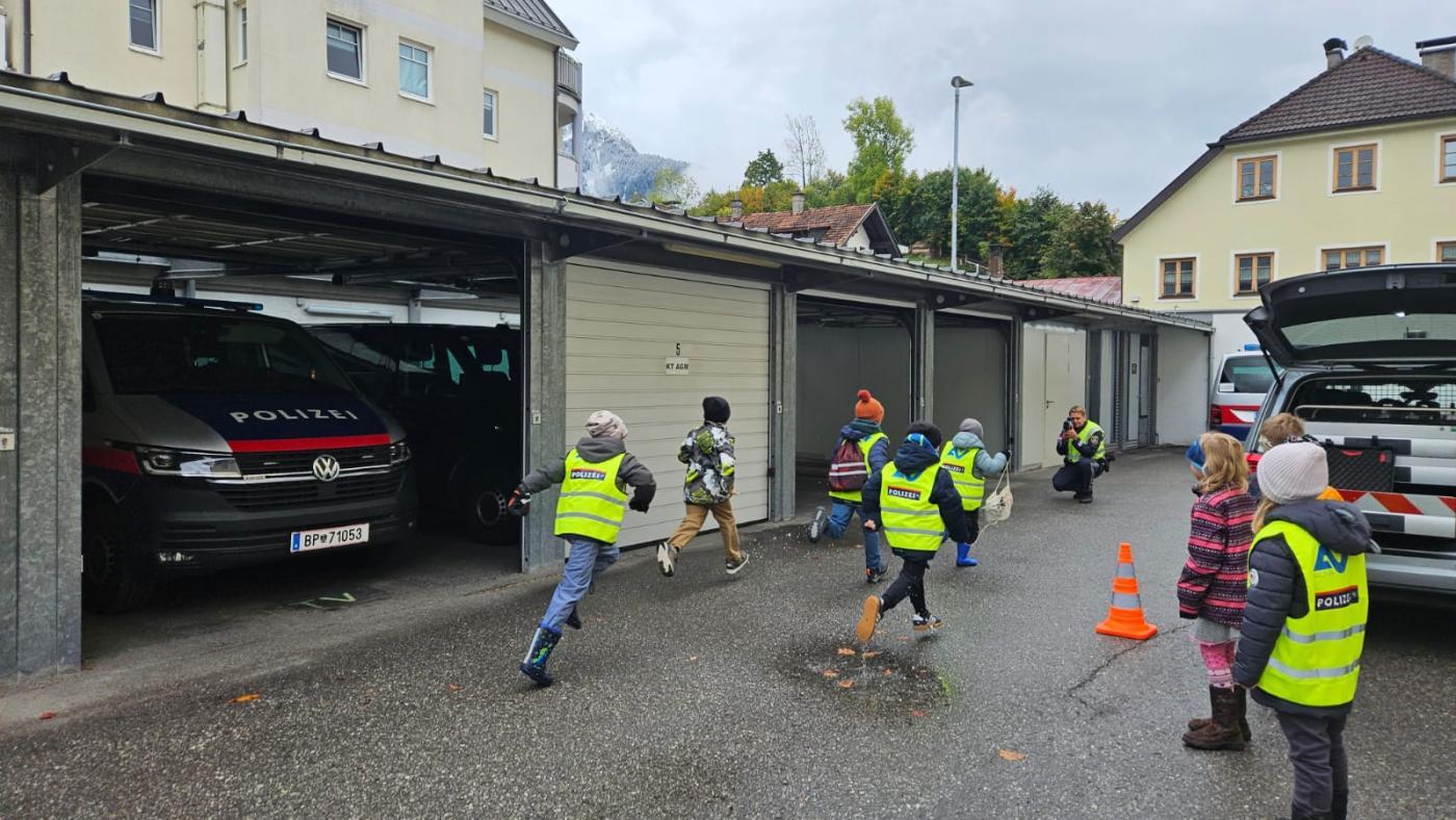Im Rahmen der Verkehrserziehung besuchten die 1. und 2. Klasse die Polizei in Reutte. Beim Bahnhof wurden wir vom Polizisten Levin erwartet. Zuerst zeigte er uns gemeinsam mit der Volksschule Pinswang das richtige Verhalten bei einem Bahnhof. Danach lernten die Schüler unter der Anleitung des Polizisten, das richtige Gehen entlang der Straße, wie sie richtig auf den Verkehr achten, Blickkontakt mit den Fahrern aufnehmen und die Straße sicher überqueren. Anschließend durften wir noch das Gefängnis anschauen. Besonders spannend war, als Levin uns das Einsatzfahrzeug und die Ausrüstung, die er bei sich trägt zeigte. 5 Schüler wurden sogar mit der Radarpistole gemessen, wie schnell sie laufen können.