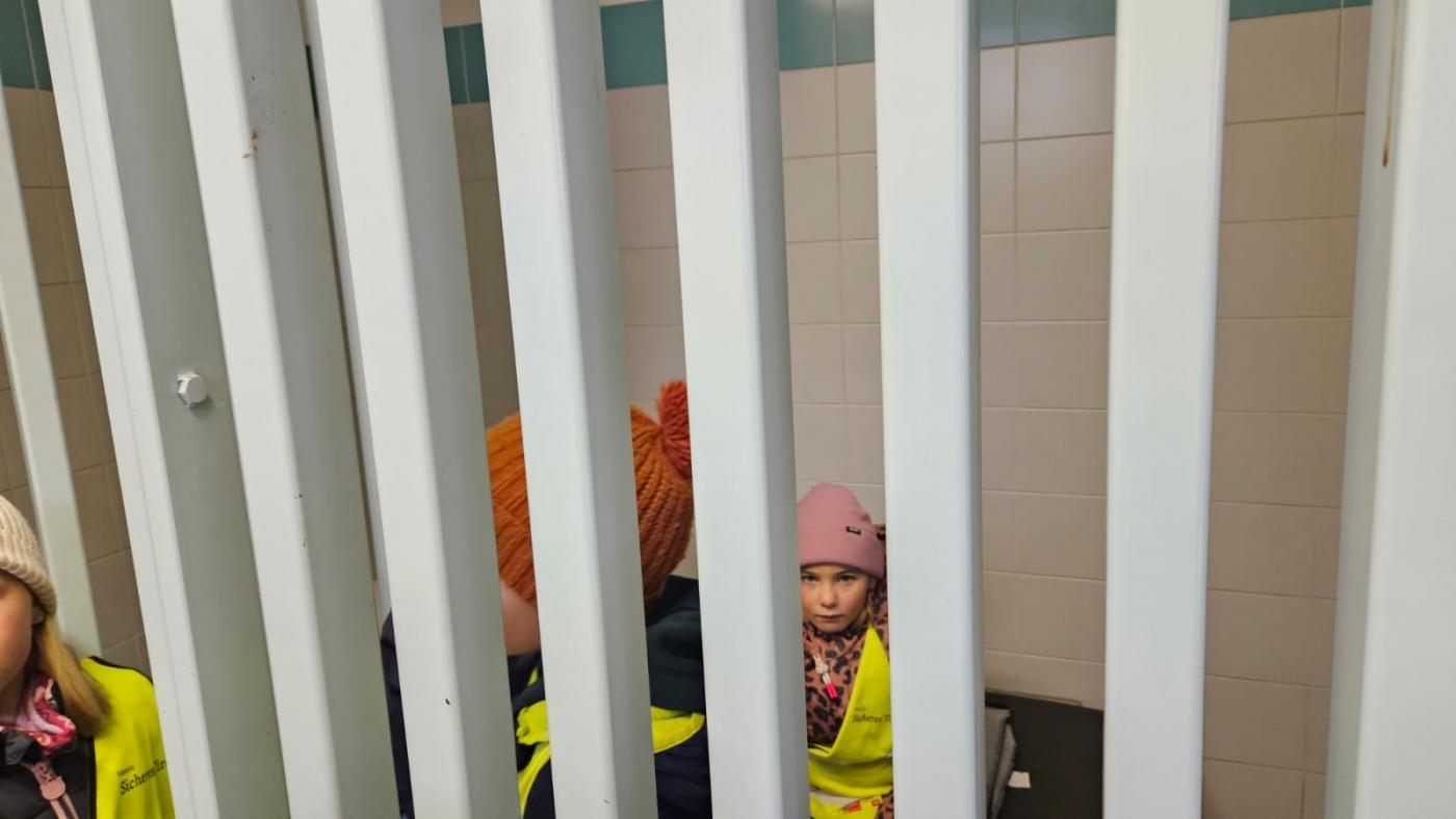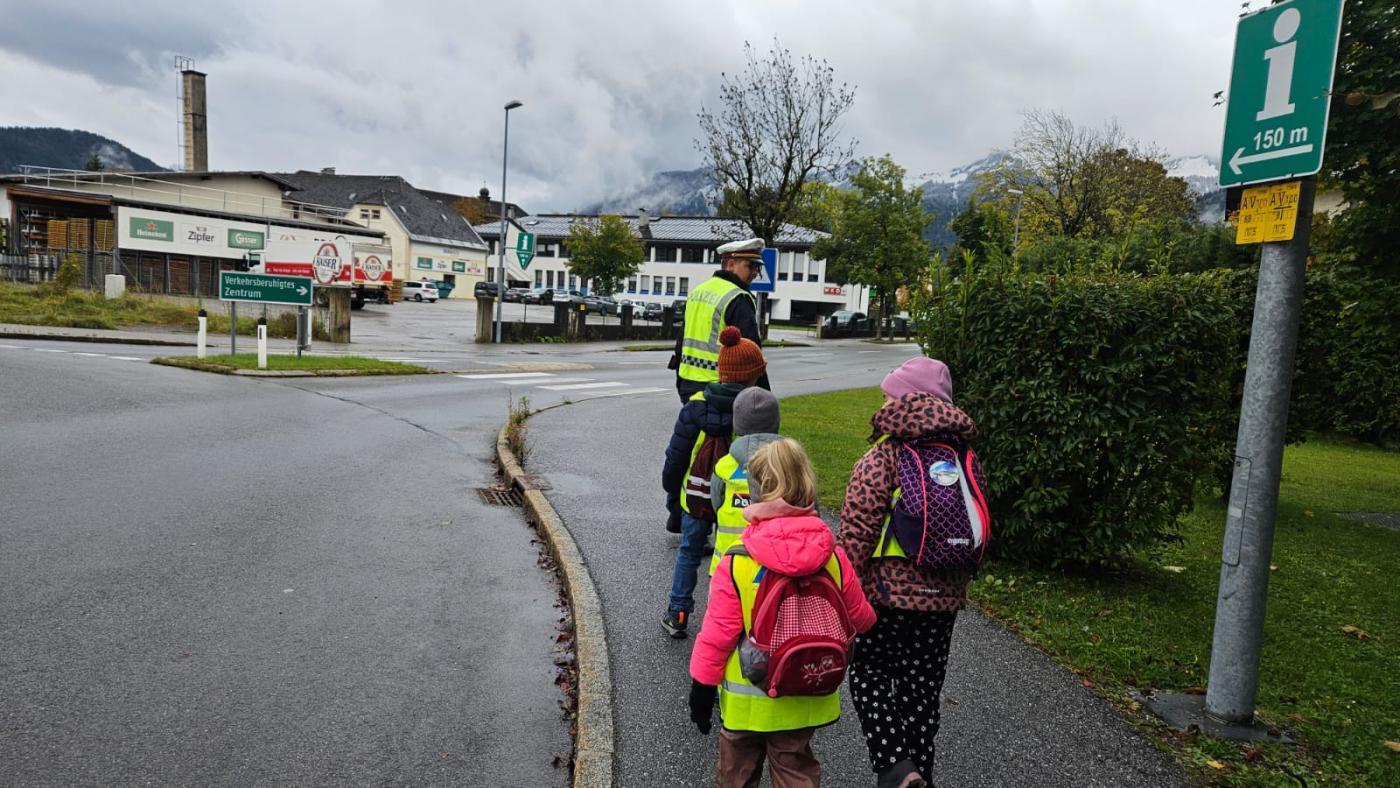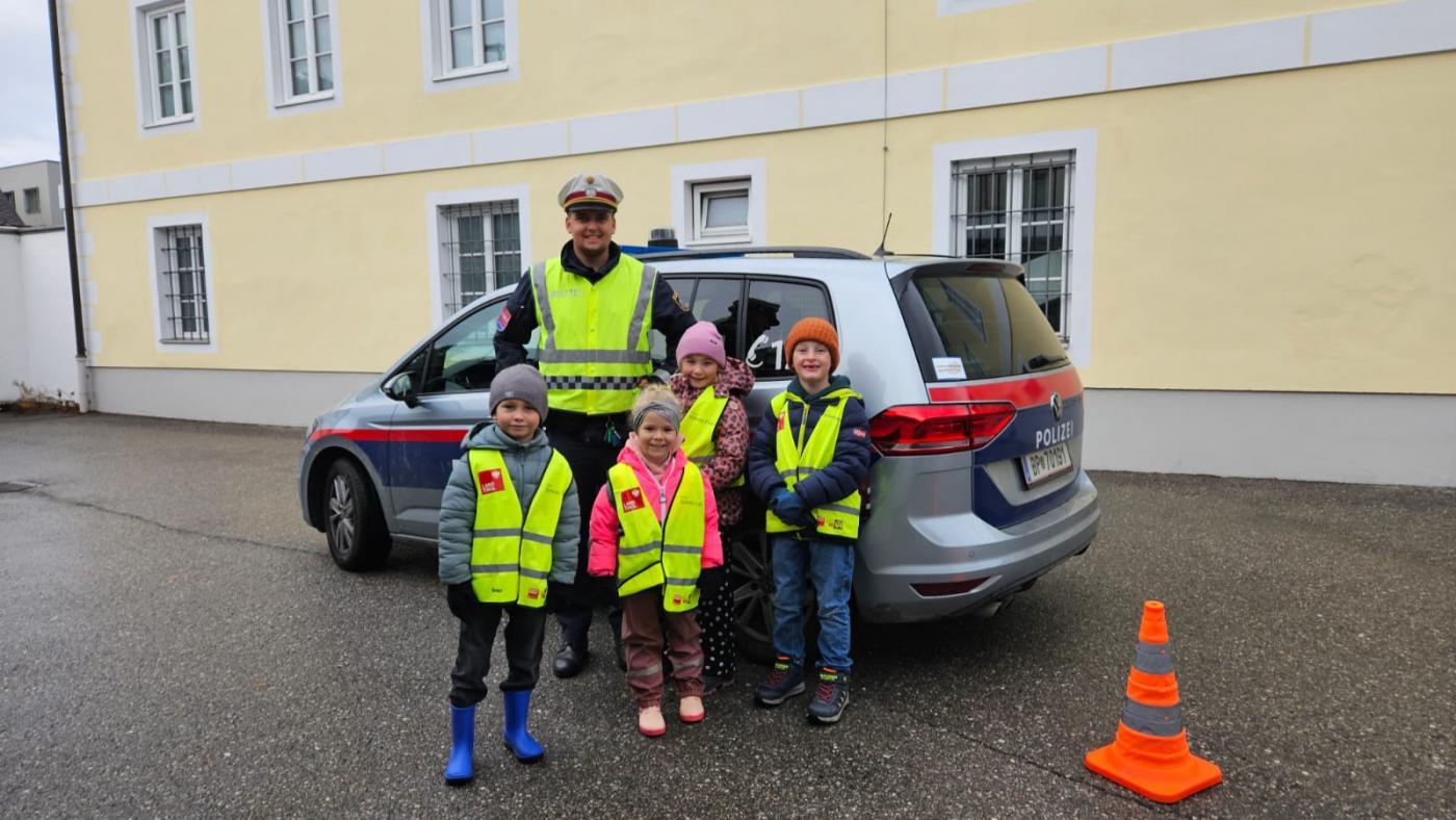 Im Rahmen der Verkehrserziehung besuchten die 1. und 2. Klasse die Polizei in Reutte. Beim Bahnhof wurden wir vom Polizisten Levin erwartet. Zuerst zeigte er uns gemeinsam mit der Volksschule Pinswang das richtige Verhalten bei einem Bahnhof. Danach lernten die Schüler unter der Anleitung des Polizisten, das richtige Gehen entlang der Straße, wie sie richtig auf den Verkehr achten, Blickkontakt mit den Fahrern aufnehmen und die Straße sicher überqueren. Anschließend durften wir noch das Gefängnis anschauen. Besonders spannend war, als Levin uns das Einsatzfahrzeug und die Ausrüstung, die er bei sich trägt zeigte. 5 Schüler wurden sogar mit der Radarpistole gemessen, wie schnell sie laufen können.